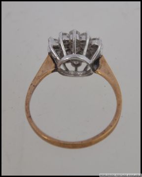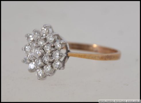 A 9ct gold and diamond vintage hallmarked London ladies ring. The multistoned flower head adorned with just under .95pnts of diamonds. Size R / Weight 2.9g