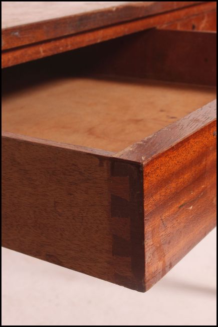 A 1960's Gordon Russell teak desk raised on squared legs with twin drawers taken from Monmouth College. Measures 75cms high x 99cms wide x 61cms depth