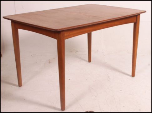 A 1960's teak drawleaf dining table, raised on tubular legs opening to reveal fold out leaf. Measure: 73cms high x 124cms wide x 83cms deep.
