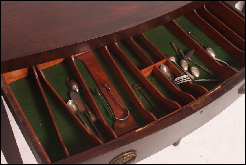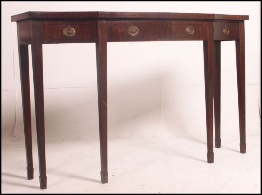 A good quality early 20th century Regency console / hall cutlery table in mahogany with ebonised string inlaid and raised on squared tapered tall supports. The drawers lined with cutlery intact. Measure:92cms high x 135cms wide x 46cms deep.
