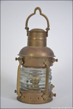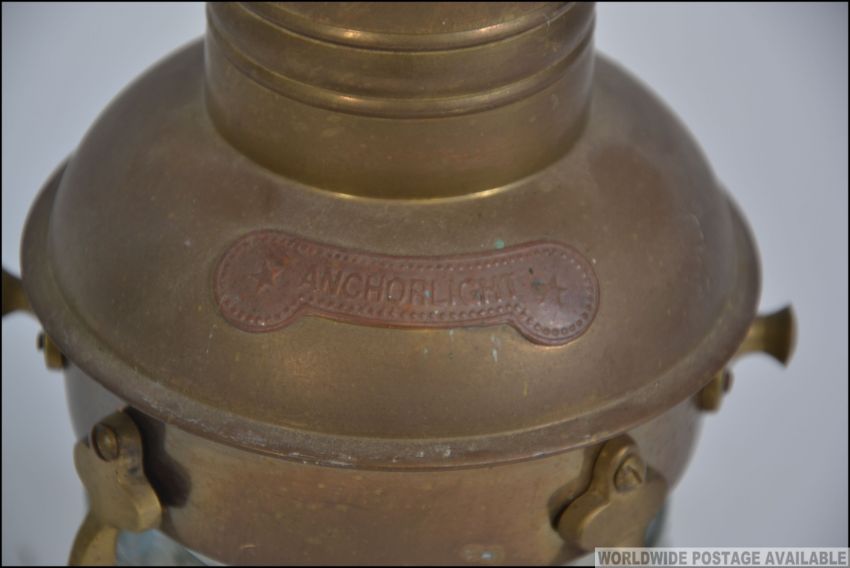 An early 20th century brass ships navigational light with cage protective bars, original glass to lamp. Notation for 'Anchorlight' to one side. Measures: 15cms high.