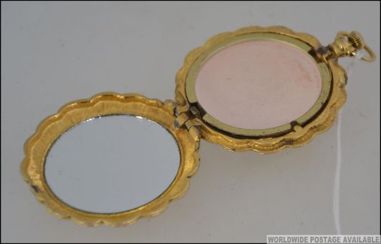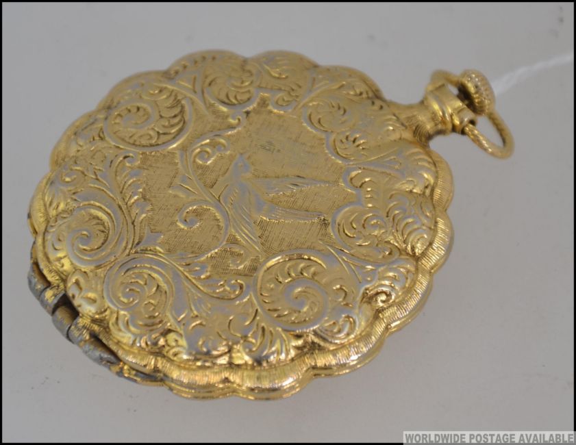 A decorative 20th century ladies compact in gilded metal case with decorative bird scene, rococo scroll work elsewhere. Weight 83.5g