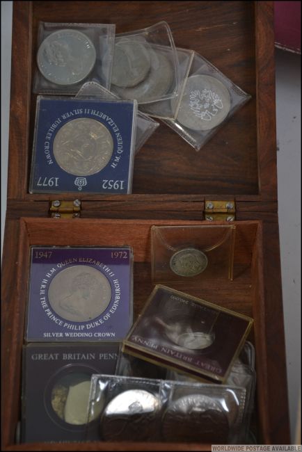 A very sizeable eclectic collection of coins from the British Empire starting from the early 19th Century , sourced from Great Britain and many other commonwealth and non-commonwealth countries , also includes carved wooden box