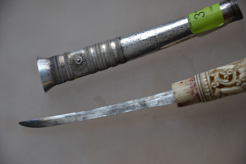 A late 19th century Anglo Indian carved Ivory handled knife, the intricately carved handle having Deities fitted with a slim stiletto style blade having a tested silver sheaf. Measures: 23cms long.