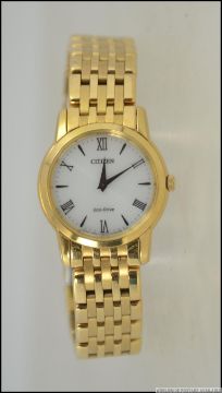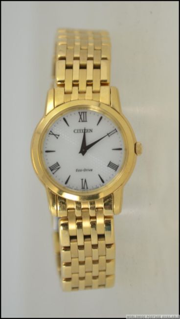 A good ladies Citizen Ecodrive wristwatch with white face and roman numeral chapter ring with faceted hands being set to gold plated mesh linked bracelet