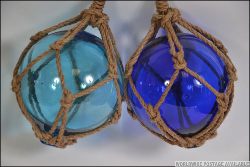 4 large vintage glass floats - coloured glass to include blue, greens etc all in rope twine. Measures: 53cms long.