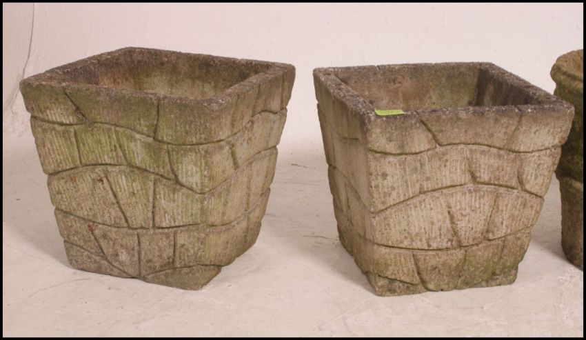 A pair of reconstituted weathered stone square section garden planters; together with a further circular pair. Measures: 32cms high x 43cms diameter.