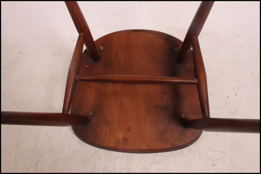 A 1950's original low Lucian Ercolani for Ercol Windsor (414) style low back desk / dressing chair raised on tapered turned legs with panel seat and stub half moon backrest. Matching desk in lot 1271. Measures: 63cms high x 42cms wide x 42cms deep.
