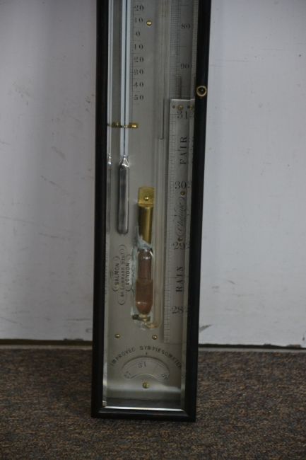 A 19th Century Marine Rosewood ' Improved Sympiesometer ' ( Barometer ), Salmon, 48 Lombard Street, London, the compact barometer with glazed front, houses a traditional mercury thermometer and a J-shaped barometer tube, with adjustable scale to right side and a shaped aperture to record previous reading. 53cm high, 8.5cm wide, 4.5cm deep