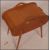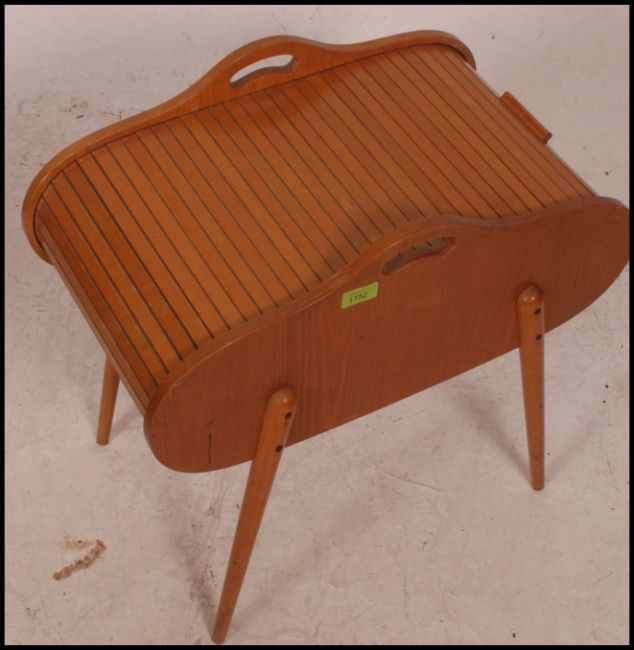 A 1950's mid century blond wood tambour top sewing box with appointed interior and raised on tapered legs. Measure: 56cms high x 57cms wide x 32cms deep.