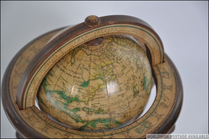 A 19th century style terrestrial library globe set within a wooden gimble frame, Measures: 27cms high.
