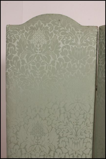 A stunning three fold dressing screen having a soft green satin covering over wooden frames with recurring patterns running throughout and finished with brass studs. Measures: 150cms high x 127cms wide x 4cms deep.