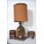 A nautical themed lamp in the form of a ships block pulley raised on a square base with rope below a Hessian shade along with a pair of Lister coopered oak planters H85cm