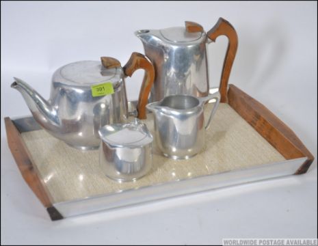 A Piquot Ware set to include teapot , hot water jug , milk jug , sugar bowl and an interesting part melamine tray