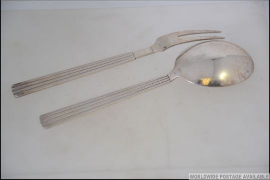 A mid century Georg Jensen Sterling Silver marked serving spoon and fork in the Bernadotte Pattern. Each with reeded tapering handles. Weight 152.0g