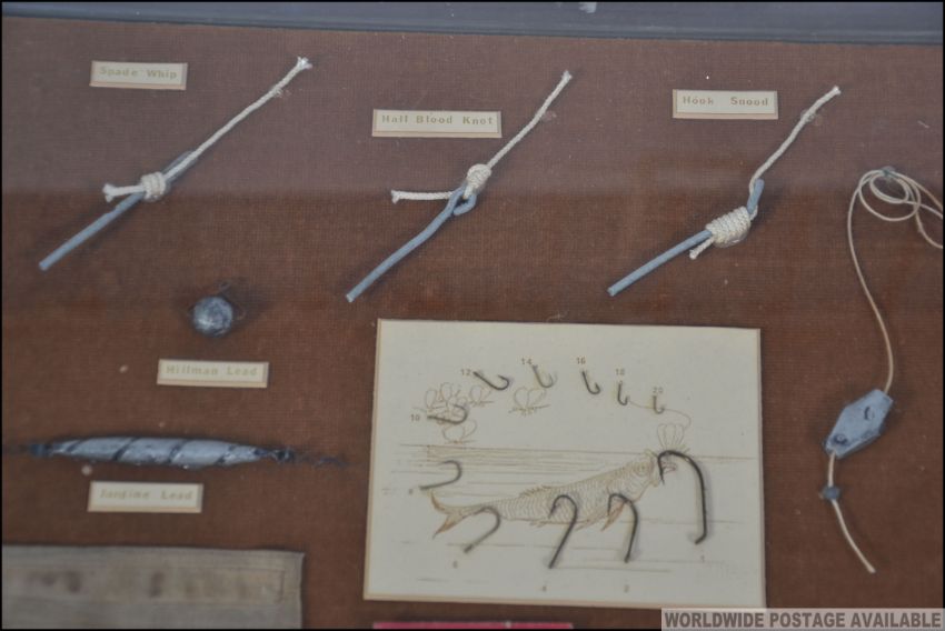 A framed and mounted montage of fishing items to include hooks, weights, Hardy's label etc. Measures: 44cms high x 57cms wide.