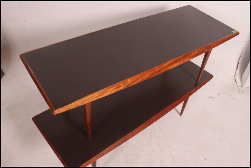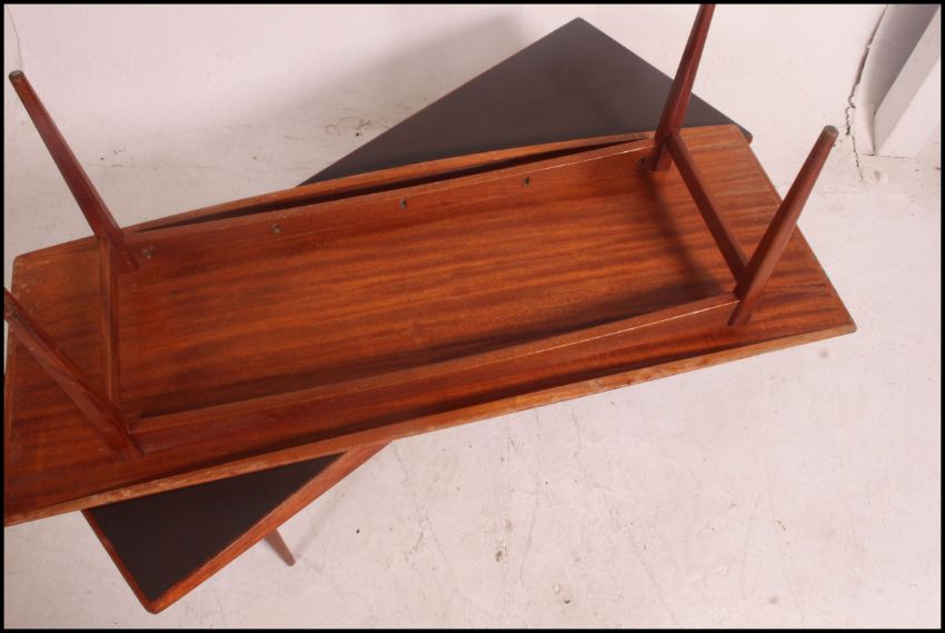 A pair olf 1960's teak wood Gordon Russell rectangular coffee / occasional tables raised on tapered supports having upcycled painted tops. Measures 40cms x 121 cms x 47cms