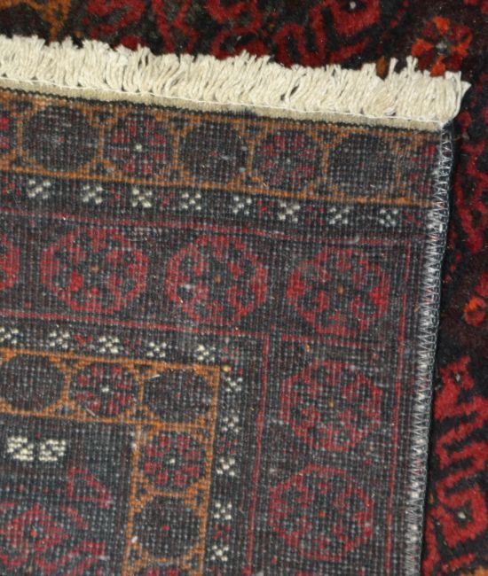 A Persian - Iranian -Baluchestan rug of wool construction being hand knotted with black and red ground with central medallions. Measures 95cms x 210cms