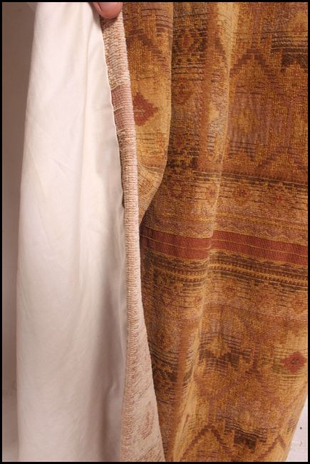 A pair of heavy long fully lined tapestry curtains along with a metal curtain pole and hooks. Measure: 210cms high x 125cms wide.
