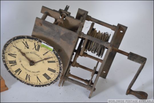 A vintage ' The Lea Recorder Co Ltd ' clock movement along with a Victorian eight day movement having an enamel chapter ring with open escapement in a later case H35cm
