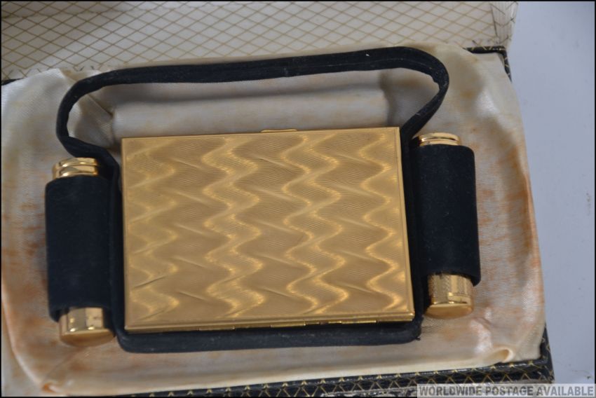 A cased 1950's Kigu of London cigarette case and compact companion set with suede upholstered case having lipstick holders. In original presentation box. Measures: 12cms wide.