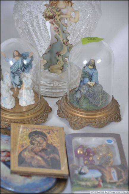 A collection of religious figurines in glass globes together with wooden panel icon etc. Measures: 21cms high.