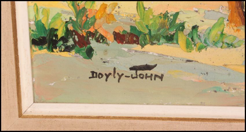 Doyly John (1906-1993) An oil on canvas painting of a Mediterranean Harbour Scene, the painting entitled ' Cap D'Antibes ' Near Nice, South France. Signed to the lower corner and framed. Measures 75cms x 42cms