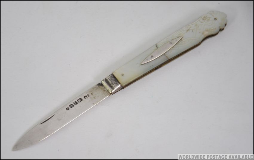A silver pill shaped snuff box with hallmarks believed to be Arthur & John Zimmerman or A & J Zimmerman Ltd, Birmingham 1904, weight 56.1g. Together with a silver hallmarked and mother of pearl pen knife / fruit knife by Martin Bros & Co, Sheffield 1873. Total weight 25.9g W7cm