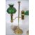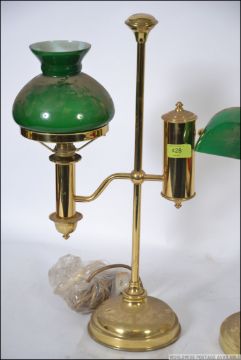 A 20th century antique style bankers lamp with green glass shade together with a brass and green glass coaching lamp H52cm