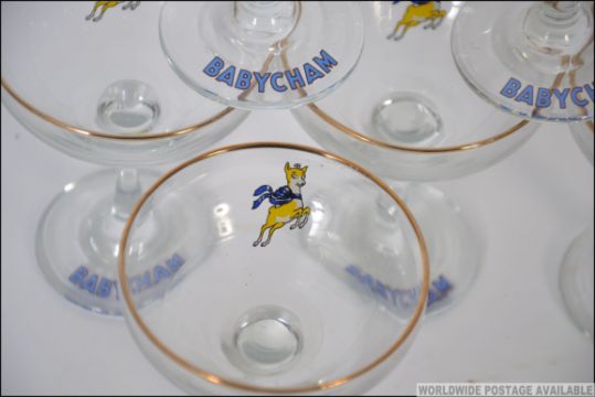 A collection of eight retro 1970's Babycham advertising glasses each applied Babycham logo to the base and yellow Babycham fawns to the bowl. Measures: 11cms high.
