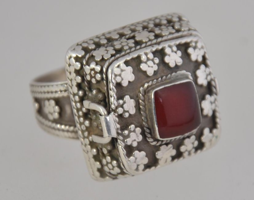 A ethinic silver ring fashioned with a perfume holder set with a central carnelian stone with filigree and granulated decoration. Size