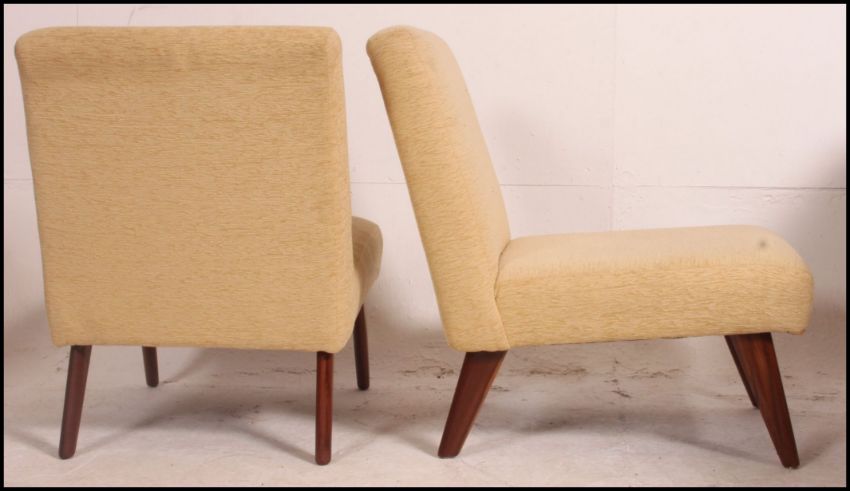 A pair of Retro 20th century square back side chairs having clean upholstered covers raised on splayed rosewood legs. Measure: 75cms high x 54cms wide x 70cms deep.