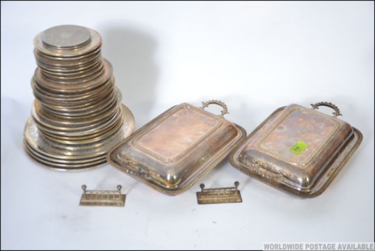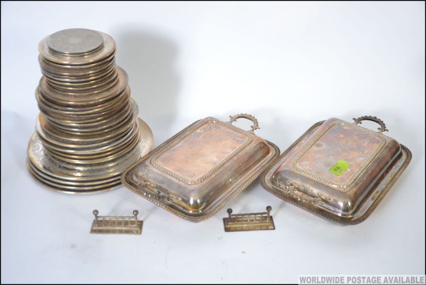 2 silver plated tureens with lids and glass liners together with an extensive collection of silver plated table mats and coasters etc W30cm