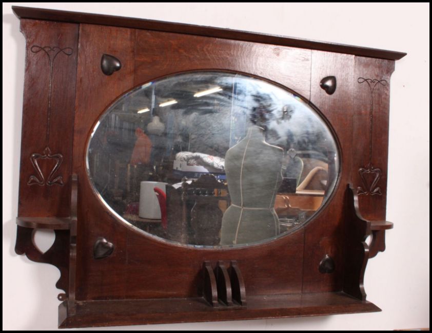 A Victorian oak Arts & Crafts overmantel mirror with shaped bevelled plate mirror having shelf base with embellished panel work. Measures(cm) Height 77 x Width 117 x Depth 19.