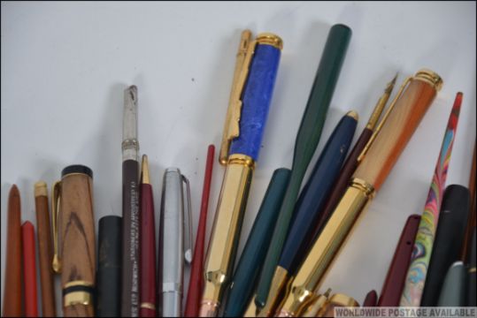 A collection of fountains pens from the 20th century to include Platignum, Parker etc along with others pencils etc