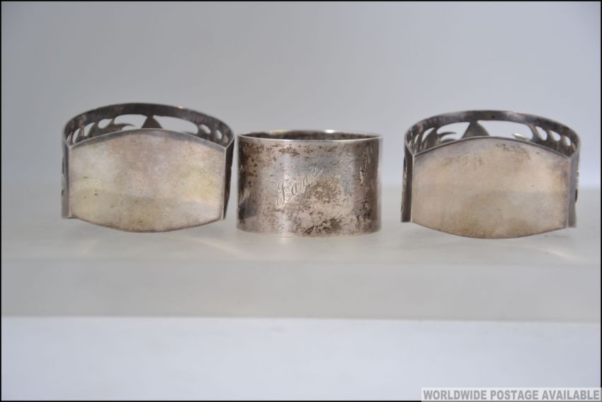 2 silver hallmarked Scottish napkin rings being lattice worked into thistles, embedded with citrine stones. Edinburgh hallmarks for 1961 possibly William Dunningham & Co. Together with another by Adie Bros, Birmingham hallmarks. Total weight 104.7g