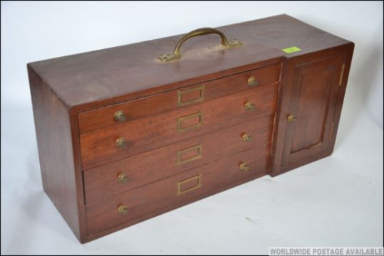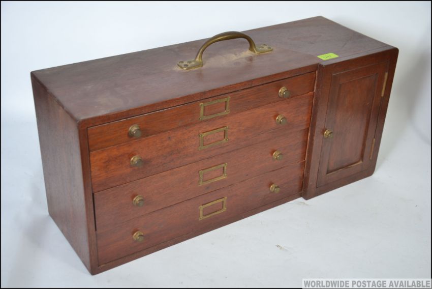 A mid 20th century engineers tool box / case having a run of four drawers next to a single door cupboard with shelved interior. Measures: 30cms high x 62cms wide x 22cms deep.