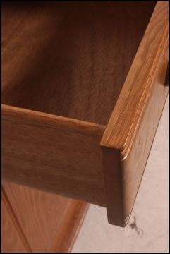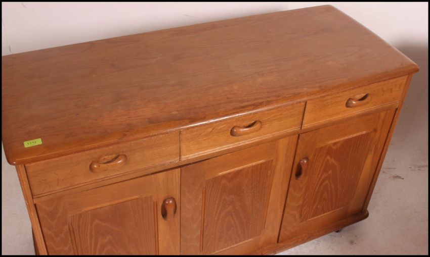 A 1970's retro Ercol style sideboard raised on ball castors with thin plinth having metamorphic cupboards under short drawers above. Measures 77cms high x 121cms wide x 49cms depth