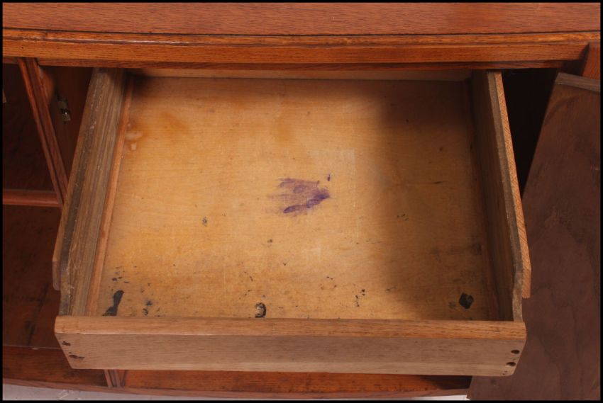 A retro mid 20th century bow front quarter veneer sideboard having two doors to the front opening to reveal two drawers and shelves, raised on square supports. Measure:v 66cms high x 37cms wide x 33cms deep.