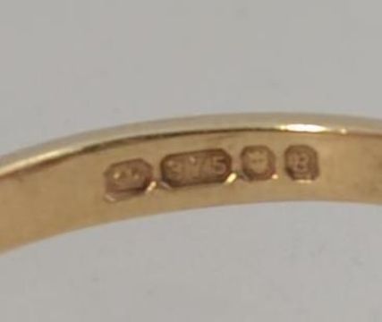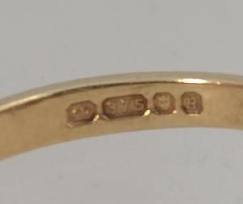 A vintage hallmarked 9ct gold amethyst and diamond ring. The round cut amethyst surrounded by 1pnt diamonds ( approx 10 pnts ) Weight 2.4g / Size L