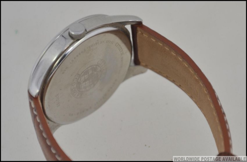 A good Citizen Ecodrive gentlemans wristwatch with black face, day date aperture being set to a brown leather strap