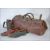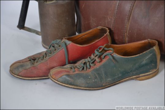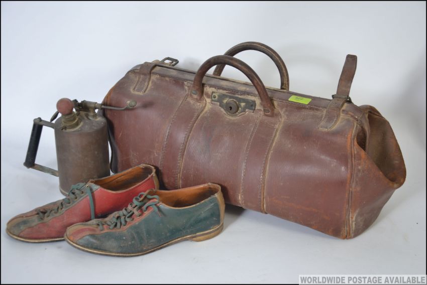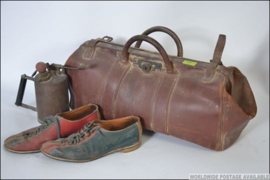 A vintage 20th leather Gladstone style bag contain a vintage brass oil dispenser and a pair of vintage leather bowling shoes W60cm