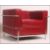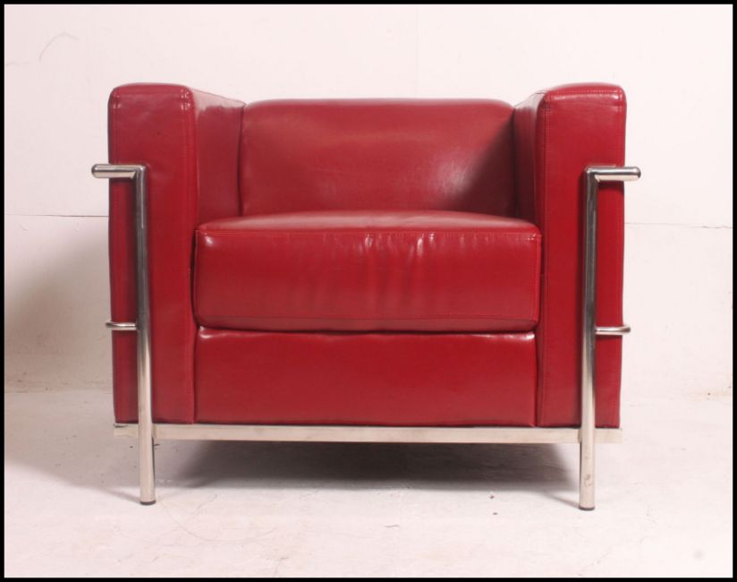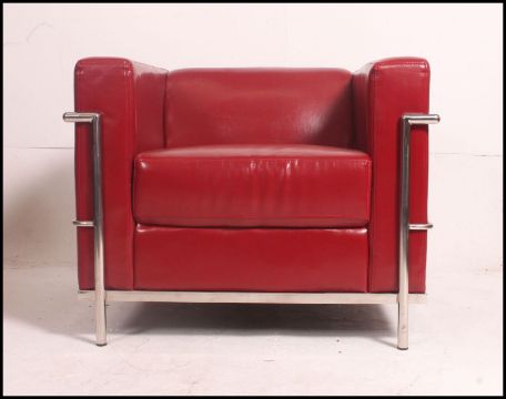 After Le Corbusier. An ' LC2 ' type red leather and chrome armchair. The polished chrome tubular frame with red leather seat of angular form. 69cm high, 89cm wide, 83cm deep