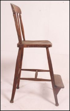 A stunning early 20th century school teachers spindle back high Stool / Chair, constructed from elm raised on tapering legs united by stretchers with a single step to the front. Stamped to the rear of the seat DCEC ( Durham County Education Committee ) Measures: 114cms high.