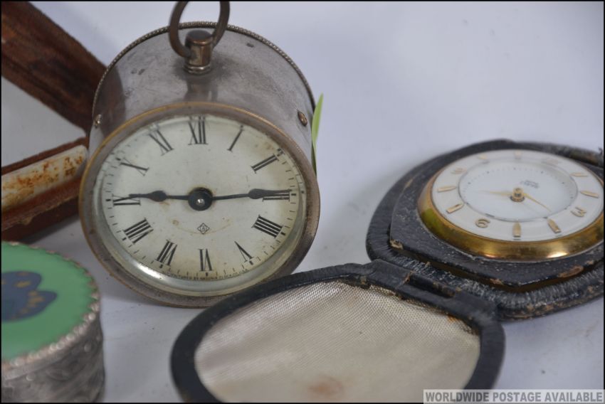 A collection of items to include a Smiths travel clock, a meerschaum pipe with carved ders in case, a barrel clock and a pin dish