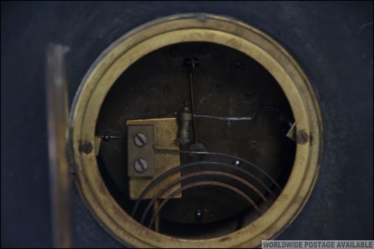 A 19th century marble / slate eight day mantle clock having double column supports with classical scene panels, an enamel face with roman numeral chapter ring W31cm