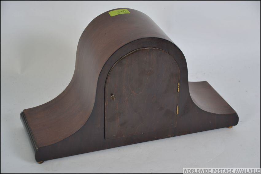 A 1930's napoleons hat mantel clock with silvered dial, roman numeral chapter ring having inset Westminster chiming Junghans movement. Measures: 23cms high.