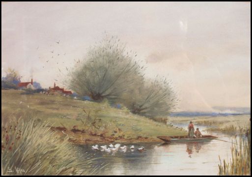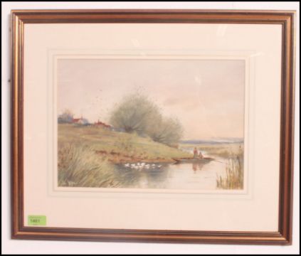 Bartram Hiles (1872-1927) England. A river scene with ducks and fisherman having village to the background. Signed to the corner. Measures 25cms x 37cms