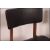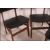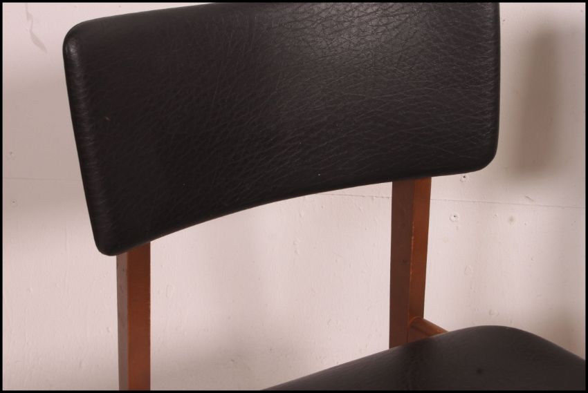 4 vintage framed teak dining chairs having black faux leather padded seats and back rests