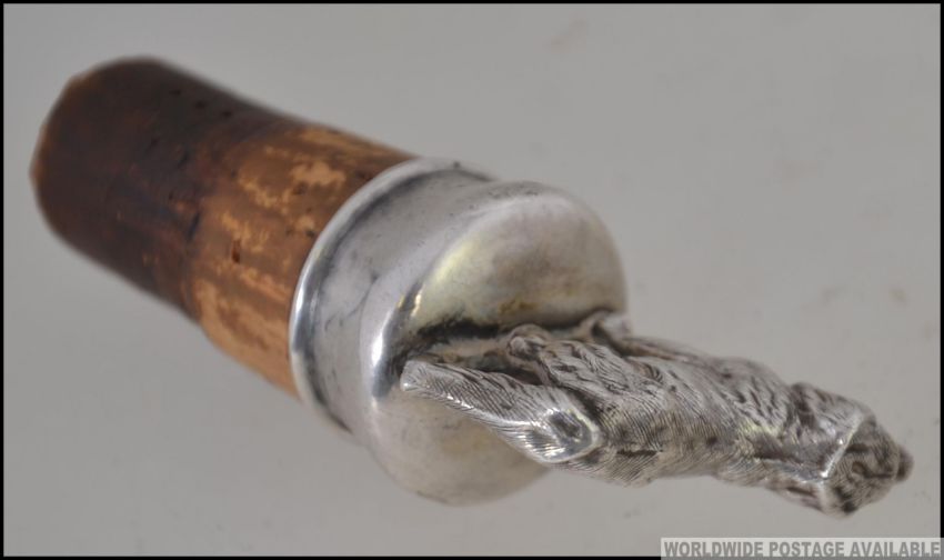 A silver (tested) metal cork bottle top adorned with figurine of a dog together with 2 white metal decanter labels for G & W ( Gin & Whisky ) Silver bottle top 16.9g H8cm